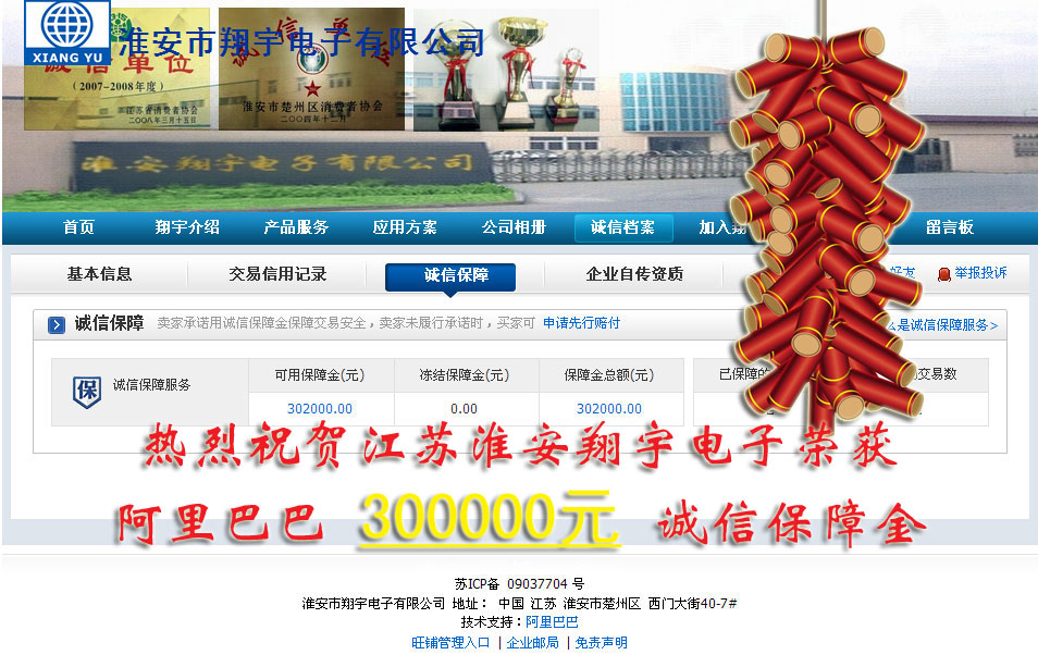 熱烈祝賀我公司江蘇淮安翔宇電子有限公司榮獲阿里巴巴誠(chéng)信通300000元誠(chéng)信保障金,感謝阿里巴巴公司以及工作人員對(duì)我們堅(jiān)持誠(chéng)信,堅(jiān)持優(yōu)質(zhì)優(yōu)價(jià)的認(rèn)可與肯定, 我們將一如既往堅(jiān)持誠(chéng)信,做好產(chǎn)品,做好服務(wù),來(lái)回報(bào)廣大消費(fèi)者的厚愛與信任,并再次感謝阿里巴巴公司,誠(chéng)信通電子商務(wù)平臺(tái)以及阿里巴巴工作人員努力。我們與阿里巴巴同樣執(zhí)著于電子商務(wù)的開拓與發(fā)展,堅(jiān)信電子商務(wù)是現(xiàn)在也是未來(lái)商務(wù)的發(fā)展。